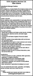 RPH Irrigation is a trusted Reinke Pivot Dealer proudly serving Southern Alberta’s agricultural community. We specialize in irrigation systems and equipment providing reliable products and dedicated service to local farmers. Our Taber branch has a position open and we are looking for a motivated, personable and professional individual to join our team.
